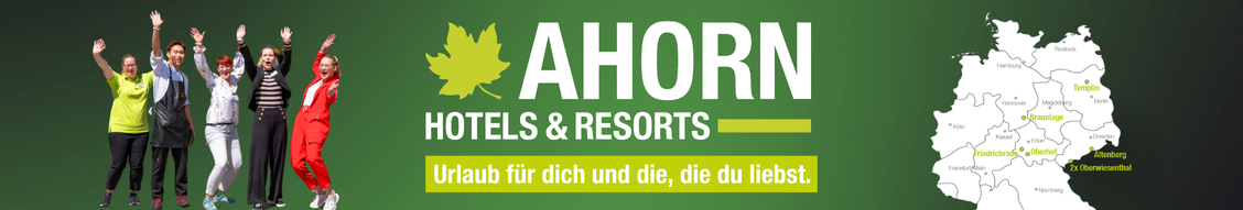 Wir sind die AHORN Hotels & Resorts! Als familiengeführte Hotelgruppe mit Hauptsitz in Berlin gehören wir mit 850 Mitarbeitern zu den 30 umsatzstärksten Hotelketten in Deutschland. Unsere sieben Hotels befinden sich in den schönsten Urlaubsregionen Deutschlands in Brandenburg, Niedersachsen, Sachsen und Thüringen.