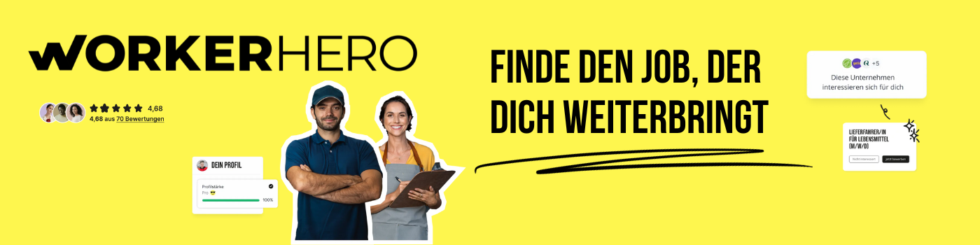 WorkerHero macht Bewerben so einfach wie nie: Mit nur einem Profil kannst du dich auf tausende Jobs bewerben – oft ohne Anschreiben oder Lebenslauf. Wir legen Wert auf Transparenz bei Gehältern, bieten faire Bezahlung und exklusive Vorteile wie Empfehlungsprämien und kostenfreie Kurse, die deine Karriere pushen.